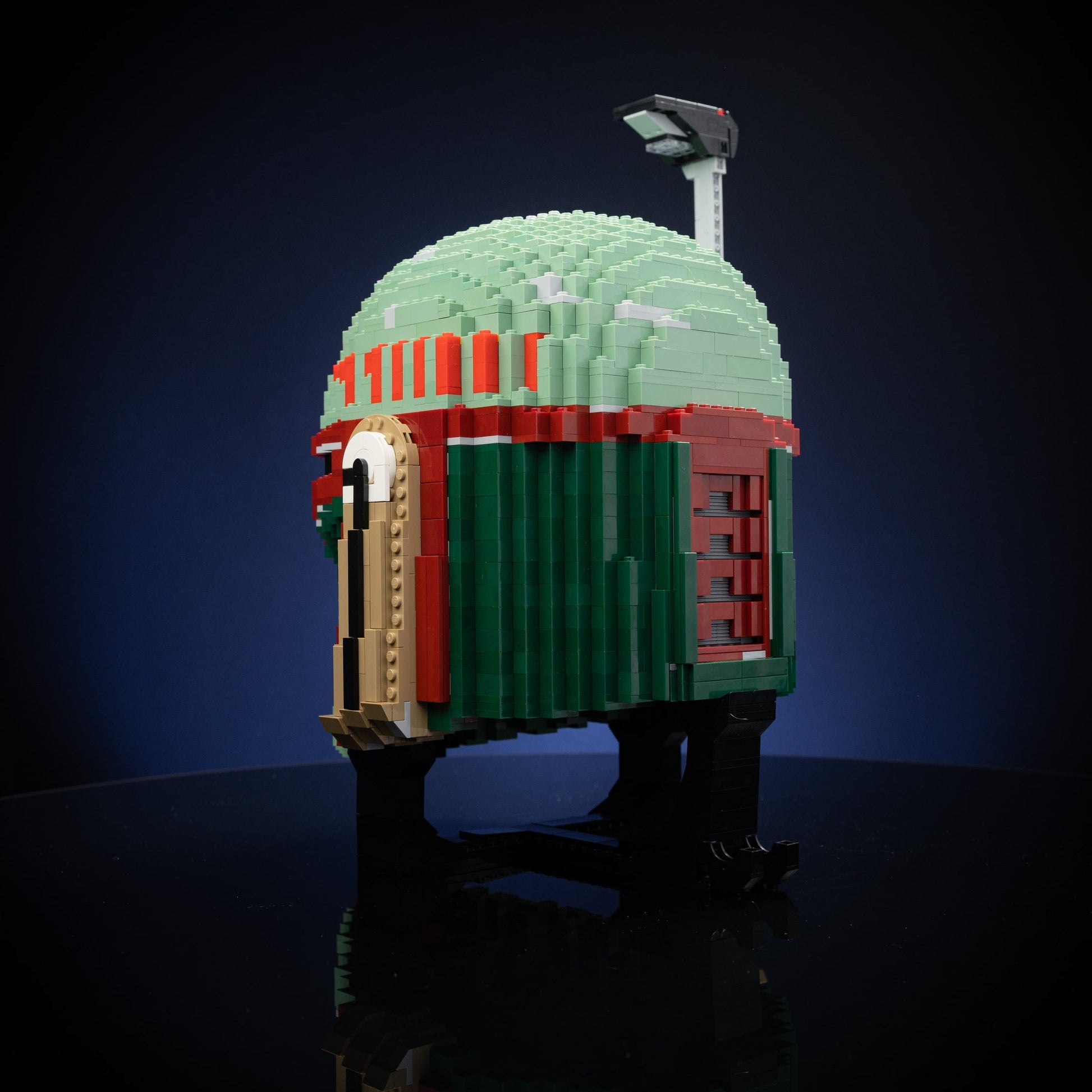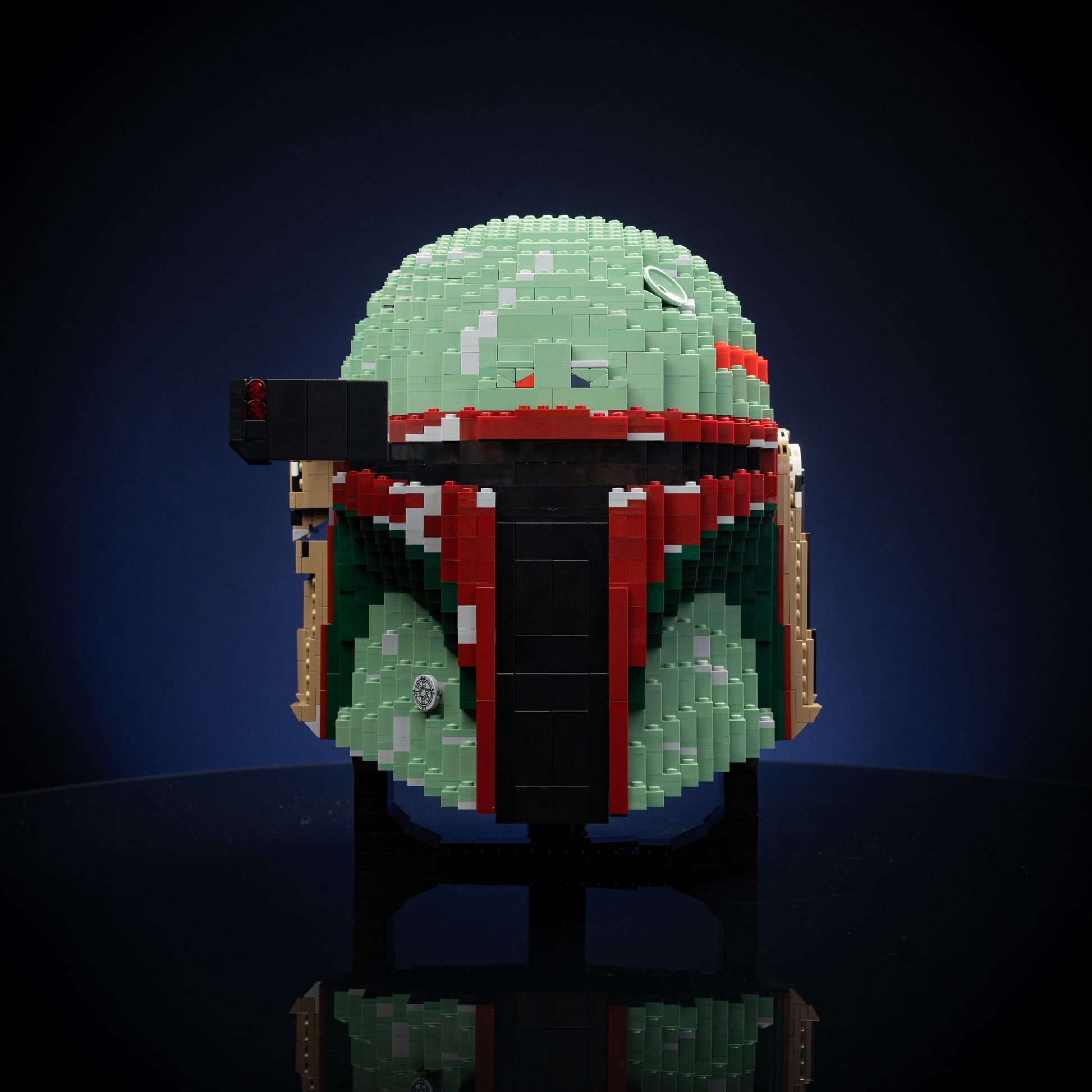 Built with over 2,500 LEGO® bricks, this is the ultimate display piece for fans of the legendary bounty hunter. This life-sized replica towers at well over a foot (348mm) tall with every detail captured from the customizable tally marks where you can choose from Pre-Sarlacc (yellow) or Post-Sarlacc (red), detailed texturing on the sides of the helmet, and a functioning antenna that can be raised or lowered.