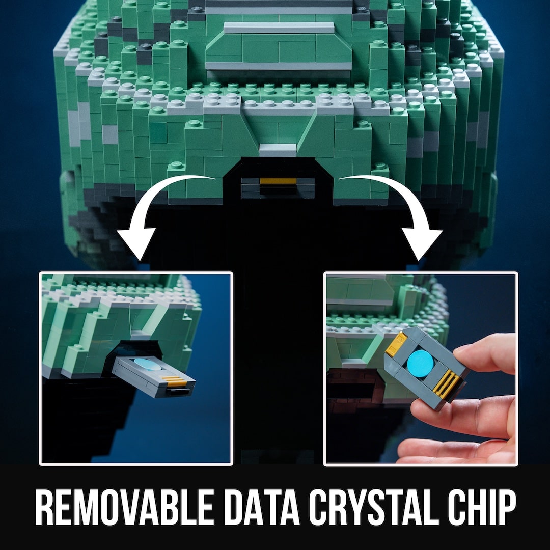 Build a custom replica of the iconic video game helmet, containing over 2,700 LEGO® bricks and standing over 10" tall. The helmet is packed with exciting features, including a removable data crystal chip, a display stand that can be stored inside the helmet. This model was designed for display in your LEGO® or video game room – the perfect companion as you play through the brand new game.